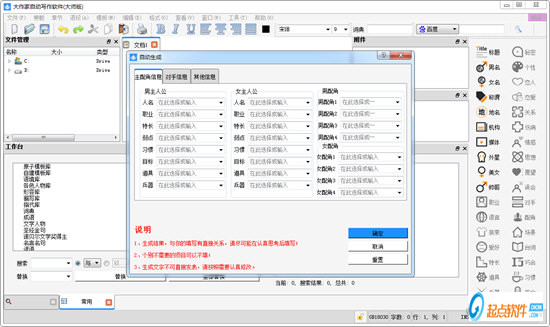 12、梗概自动生成:只要在“文件”中选择“更换模板”,然后打开“梗概自动生成模板”,再点击“工具-自动生成”,马上就可自动生成一篇一千字的梗概,在此基础上进行修改,岂不快哉!