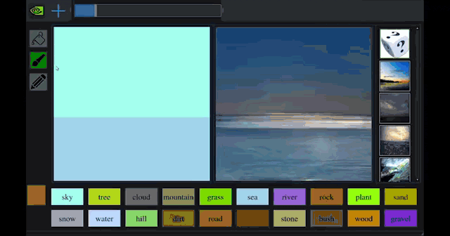 GauGAN 使用户可以画出语意分割图,并合成自己需要的场景,其中,这些分割图都需要相应的标签,如天空、大海或者雪。