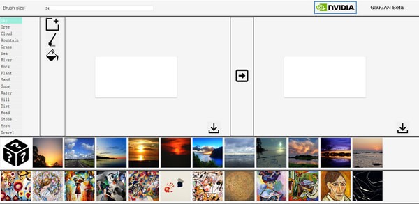 软件界面上方支持调节画笔的粗细,左方可以选择风景材质类型,比如大山、河流、森林、沙漠海洋等,下方支持更换背景。如果你不会玩,可以看看这个视频,GaoGAN的开发者们手把手教你怎么玩!
