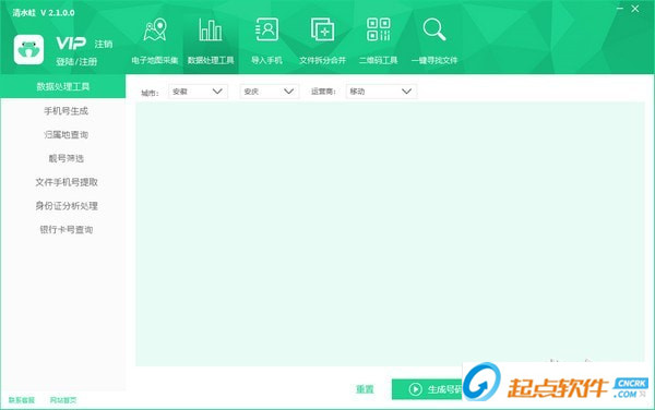 清水蛙是一款专业的多功能电脑工具箱软件,集手机号生成,归属地查询,靓号筛选,手机号提取,三大地图公开数据采集,一键导入通讯录,二维码生成为一体的数据数据处理工具。