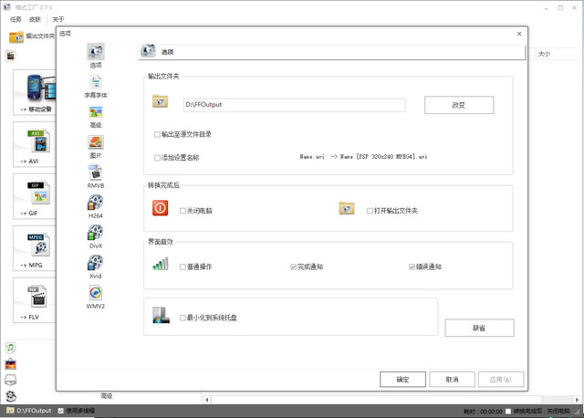 可设置文件输出配置(包括视频的屏幕大小,每秒帧数,比特率,视频编码;音频的采样率,比特率;字幕的字体与大小等)。