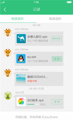 点击主界面【一键换机】右上角的【记录】按钮,可以查看收到的应用,并手动进行安装。