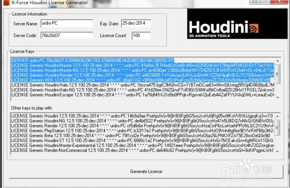 7,打开Keygen.exe,在server name和server code输入刚才记下的两项,点击Generate License,会出现一大堆认证密钥,其实我们将只会用到其中前5行
