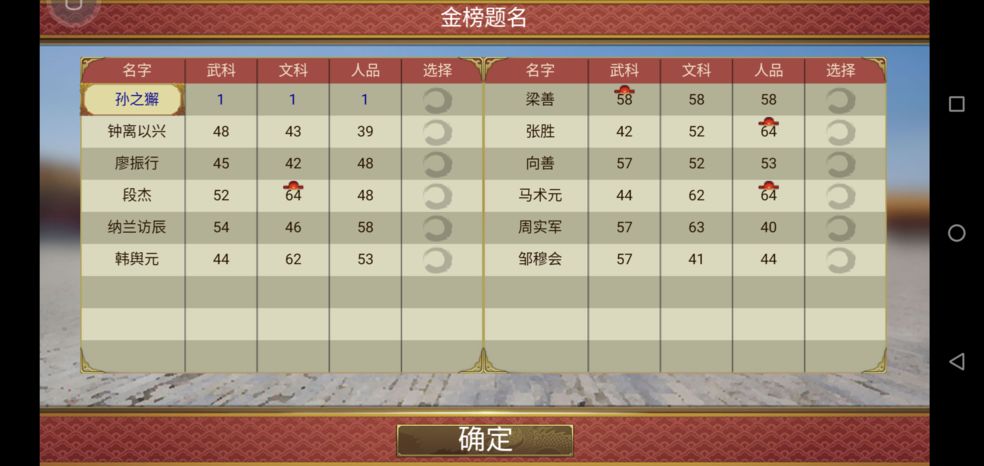 开科考试:进入游戏后,在宣政殿【吏】功能中,点击开科考试可以查看内容:每回合只能举办一次,将会出现各类出色人才供选择,更有机会发现历史名臣战将。