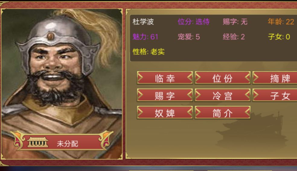 第六步,玩到中后期,还会有妃子给你介绍美女,这个出现名妃几率应该也不会特别大,但是魅力值不会低。我的这位据说是司马迁的妹妹,但是历史上司马迁有没有这样一位妹妹,who know
