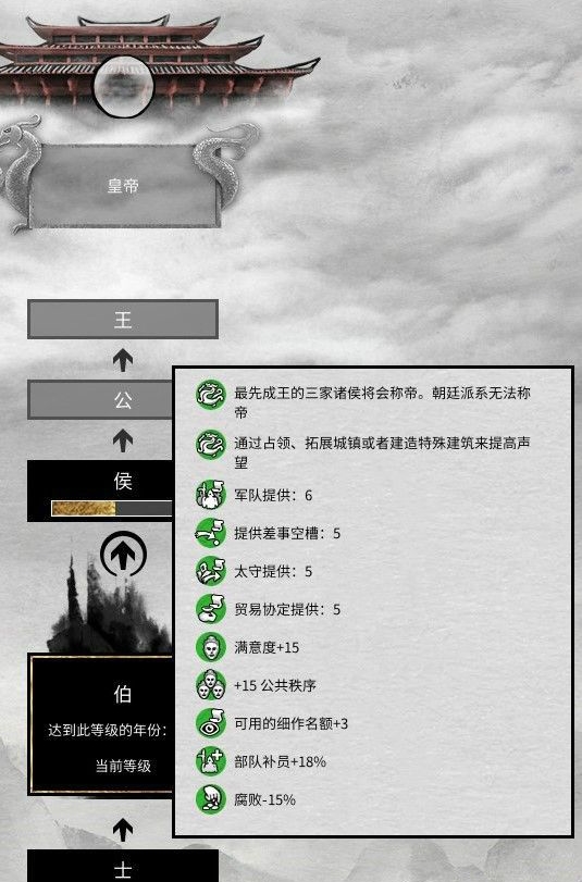 与原版相比根据爵位提供额外的太守位,满意度,公共秩序,部队补员与反腐败,随爵位增强。