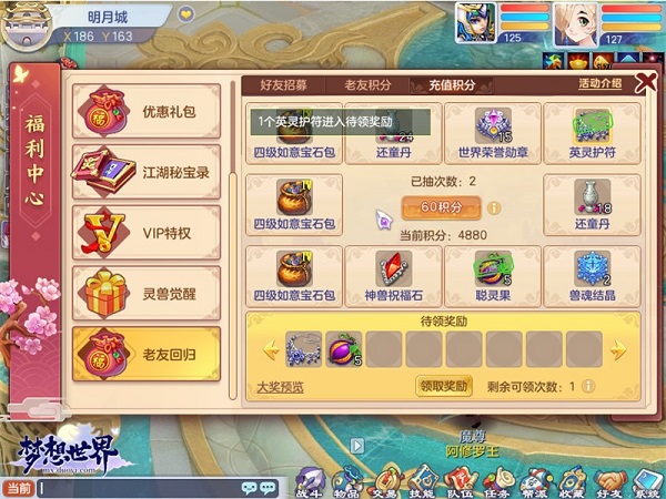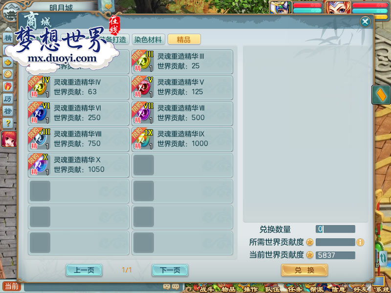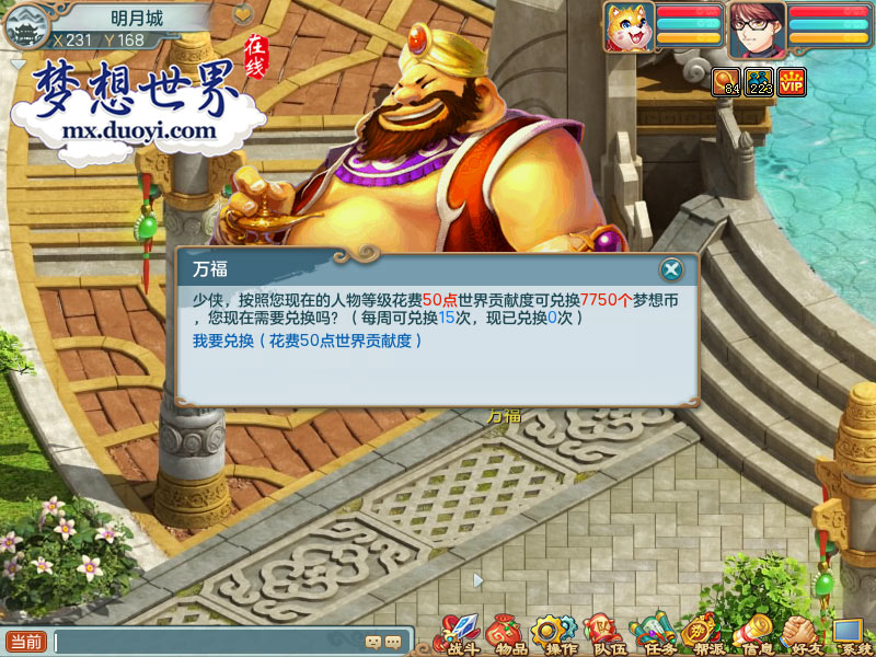 4、世贡兑换:如果愿意充钱的话,明月城(234,166)的精品交易中心处可以直接兑换梦想币,每周只能兑换15次,比例还是很实惠的,值得买完