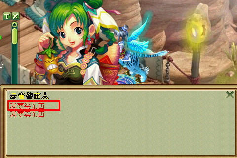 7、先点击我画红框的商人,与其对话,点“我要买东西”,如下图。