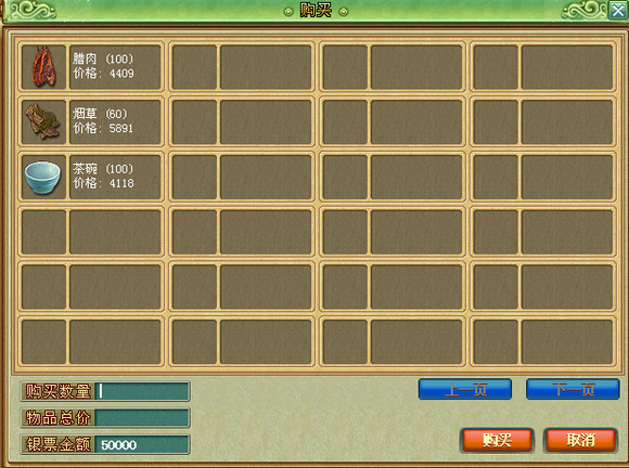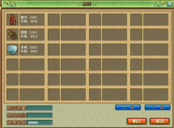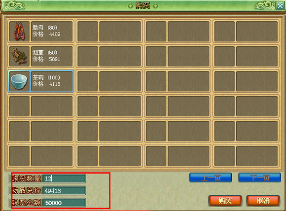 9、老样子,点击我要买东西,跳出货物栏,看下图,我们可以看到茶碗的价格是4554,比前面的高,所以我们还是要回到前面的商人那买,如果低的话那就在这里买。可能理解起来比较困难,但是亲自跑几次就熟练了
