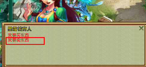 12、我们先去离入口较近的画红框处的商人那,点他,并点“我要卖东西”,如下图。
