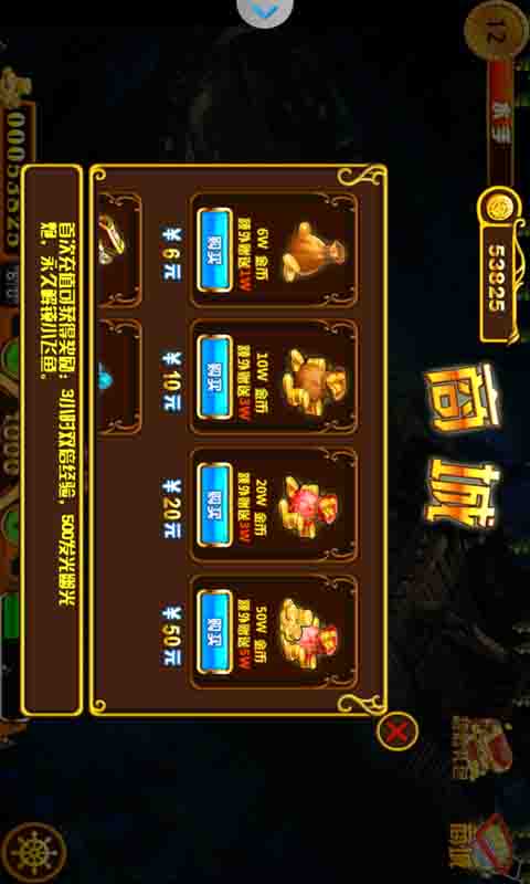 11、根据玩家充值的数量,可分为7个VIP等级,每个VIP等级都有不同的尊贵标识,使玩家在茫茫鱼海中显得与众不同。同时,对应不同的VIP等级,系统会自动开启具有特殊功能的炮台,VIP等级越高,炮台技能就越强大。