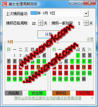 阿P软件之美女生理周期自测 V1.15 简体中文绿色免费版 阿P软件之美女生理周期自测是一款女性生理周期计算器,根据美女设置的“姨妈莅临周期”、“姨妈一般驻留”及“上次姨妈造访”计算美女的生理周期,包括“月经期”、“排卵前安全期”、“排卵日”、“排卵后安全期”及下次月经来潮日期等。计算结果以不同颜色的标签显示于本月及下月日历中,一目了然。程序简洁清新,极易上手,绿色免安装,共享版未设任何限制。更多功能敬请下载试用。