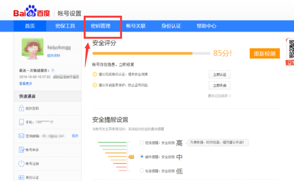 5、在账号设置主页面的上方,找到“密码管理”,点击进入密码输入页面;