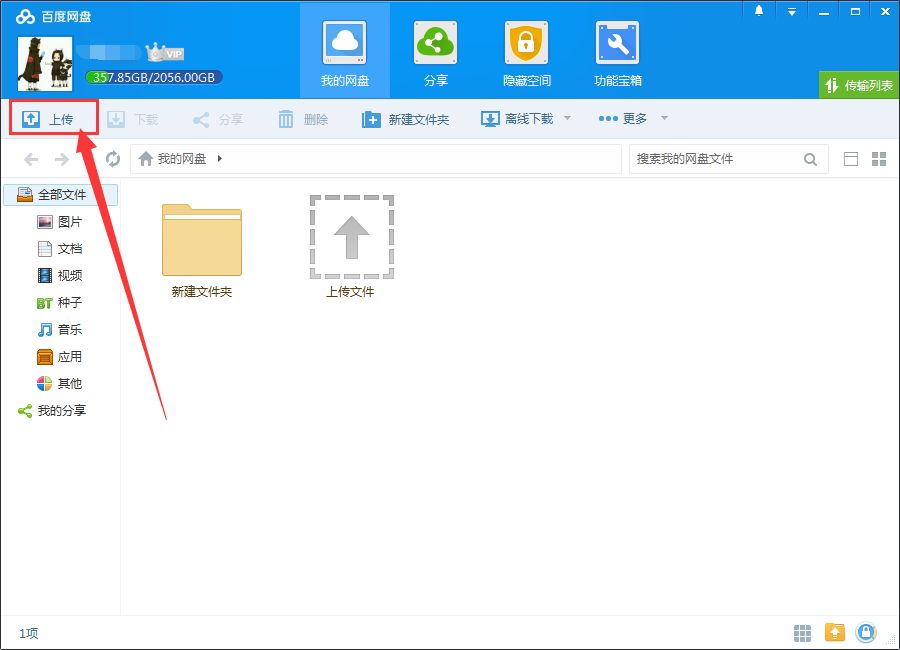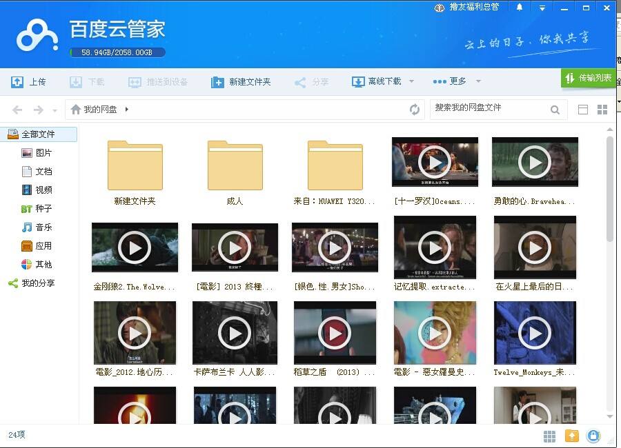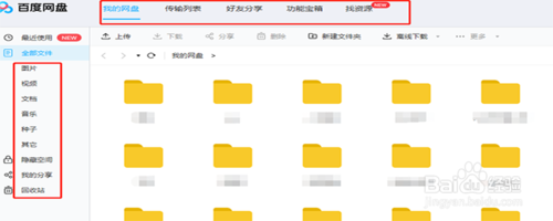 登陆成功之后,就进入了百度云的主界面,在主界面的左侧是关于文件的分类,有音乐,图片,视频,种子等分类。