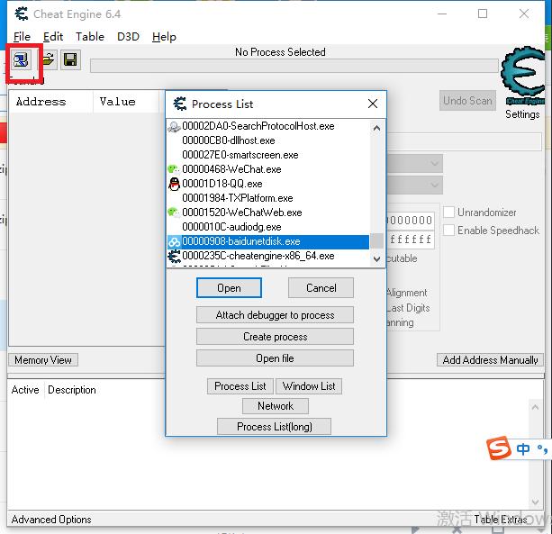 2、打开Cheat Engine,点击左上角红框内的按钮,弹出的窗口中选择百度云,点“Open”