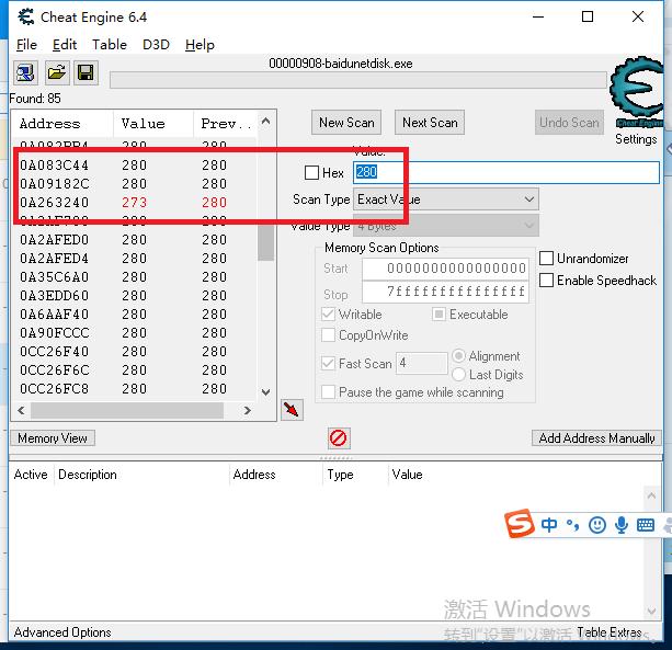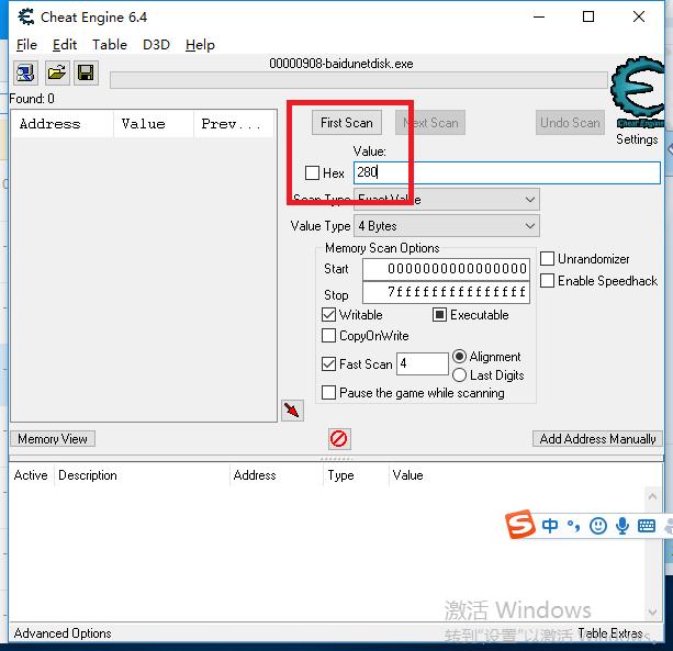 2、在红色框内输入百度云当前倒计时的下几秒数字(百度云倒计时:294,你可以输入290、288、280等),等倒计时出现你所输入数字时,点击红框内上方的“First Scan”,左侧会出现一堆数据