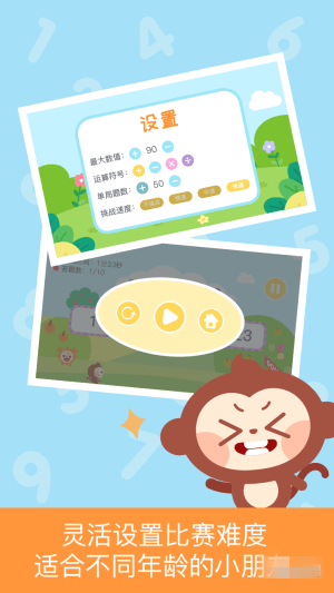 加减乘除,5到100,家长可以根据孩子的年龄和学习情况灵活设置难度,循序渐进的提升宝宝的速算能力;