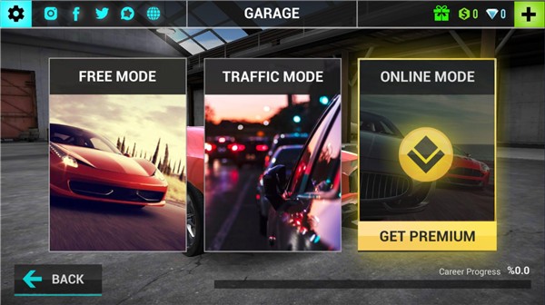 1、进入游戏后,首先可以通过左右滑动来切换汽车,选择一辆性能出色的汽车是赢得比赛的关键所在