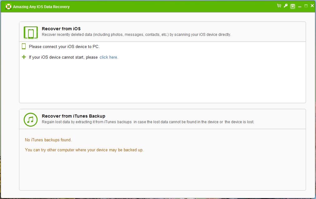 它为iOS数据恢复提供了三种恢复模式:从iOS devce恢复和从iTunes备份恢复。将设备连接到计算机并选择最适合您开始恢复的恢复模式。