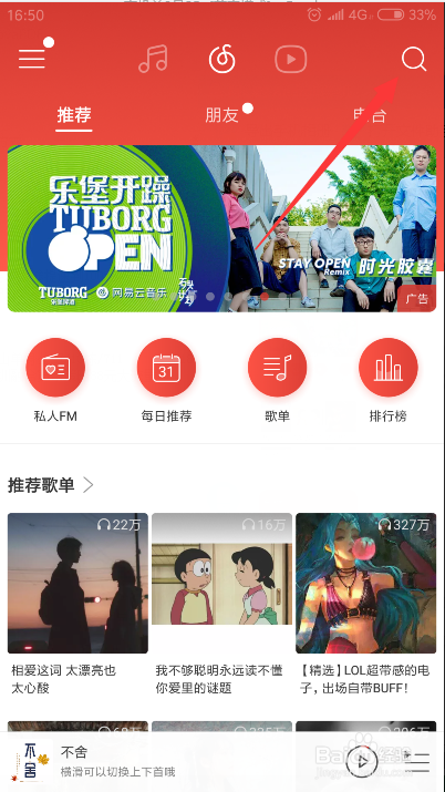 网易云音乐怎么设置手机铃声?首先我们需要正常打开手机网易云音乐,然后点击右上角的搜索功能搜索出歌曲(如下图)。