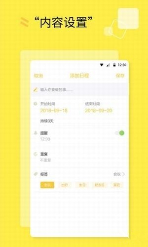 4.系统关联:关联系统自带的日程管理,并备份到云端,即使更换手机,日程资料也不怕丢失。