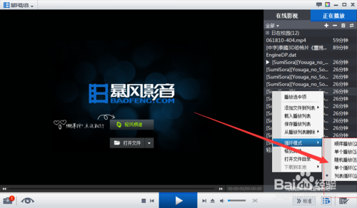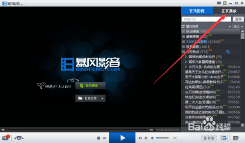 1、首先,我们打开暴风影音主页面,我们选择正在播放将播放列表切换到正在播放列表