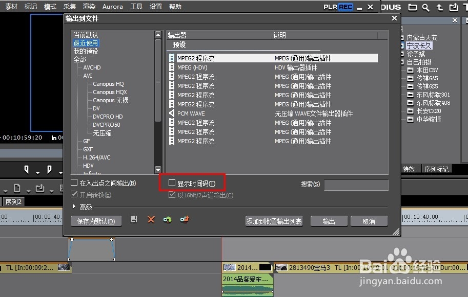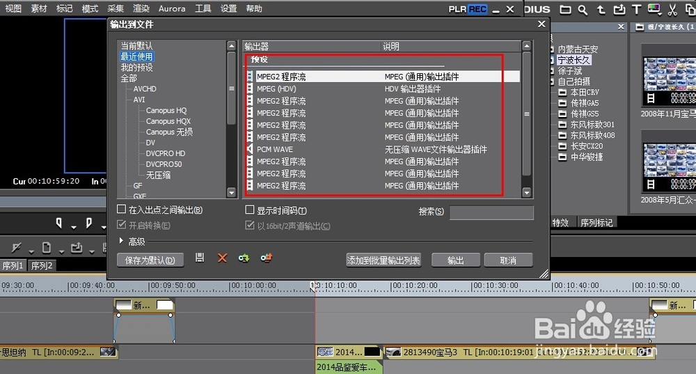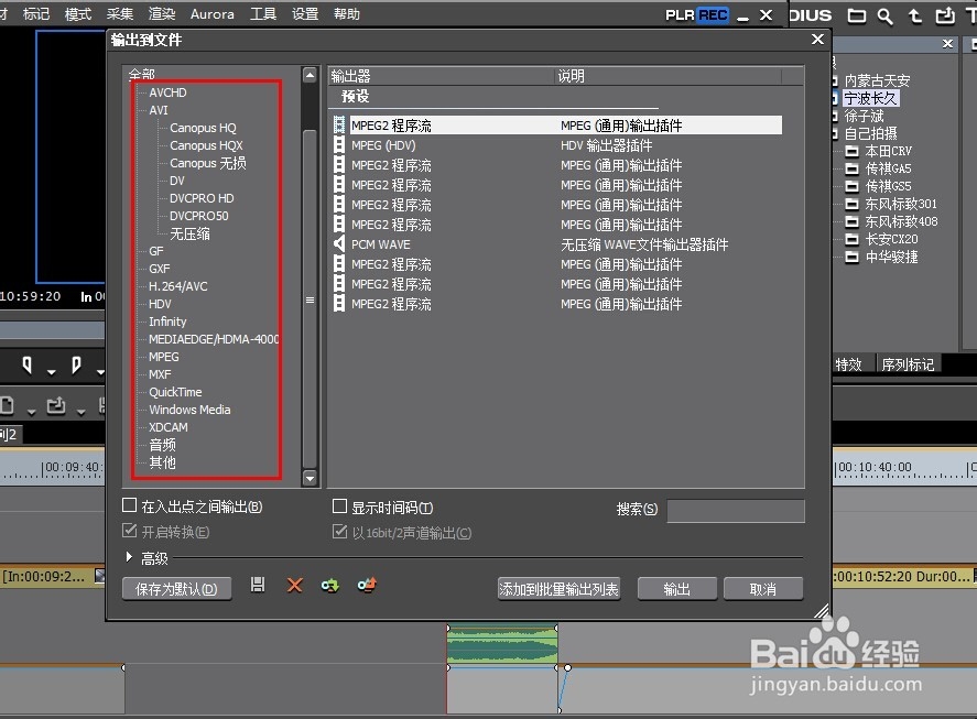 在渲染的对话框里面,有很多参数是值得我们关注的。对话框的左半部分是选择我们要输出的格式选项,我一般选择MPG格式。右边是我们最近使用过的输出格式。我们如果输出的格式和上一次或者某一次的一样的话,我们可以双击这个格式,进行再次渲染。
