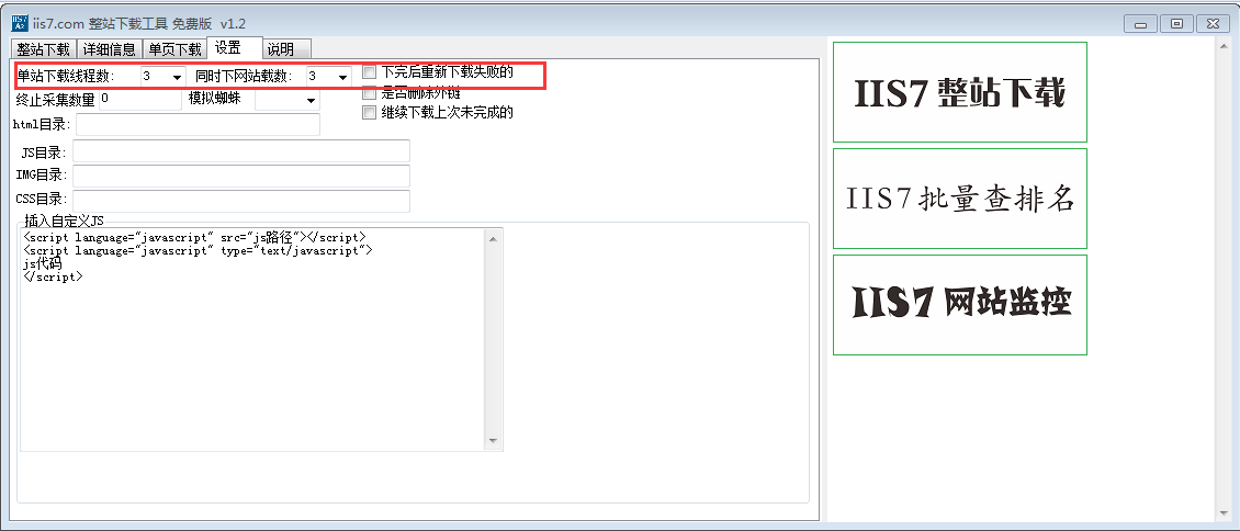 iis7整站下载工具这个程序可以多站同时下载,多站同时扒,执行完全下载之后,会下载到程序目录下的html文件夹下。它可以进行自定义,重写JS\图片\CSS路径。可以进行全站替换,根据关键词替换,N个(多个)关键词替换和多线程下载。采集下载数之后可以自动补齐404不存在连接页面,还可以插入自定义的JS。【iis7整站下载工具软件特点】