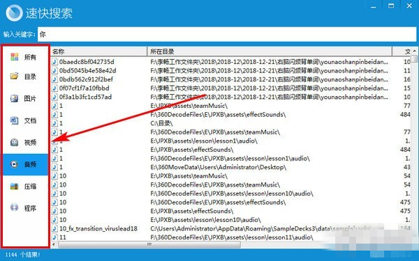 1、选择要搜索的盘符(不选择择会搜索全盘)2、选择搜索的文件类型,输入关键词即可显示搜索结果