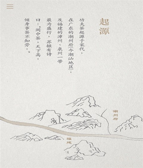 你还可以进一步了解功夫茶的历史和渊源,这个版块里面不仅文字资料筛选得用心,字句简洁易懂,而且绘画也非常的精致哦。