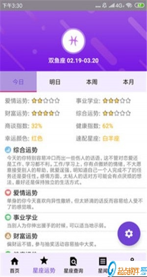 1 星座运势:全面解析你的每日星座运势,帮你了解12星座的每日,每周,每月的运势变化2 星座查询:详细分析12个星座的性格,恋爱,事业,财富