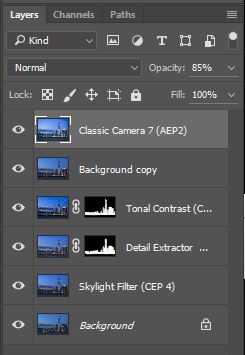和滤镜「Detail Extractor」一样,我也只想「Tonal Contrast」用于建筑物上,做法也是用图层蒙版。 另外把混合模式由正常改为亮度便解决对色彩的影响了。