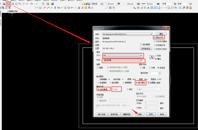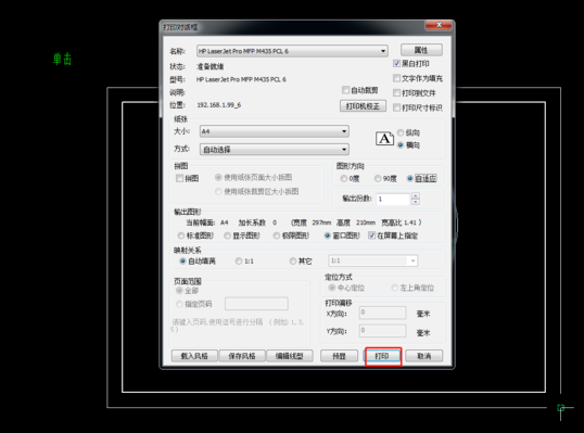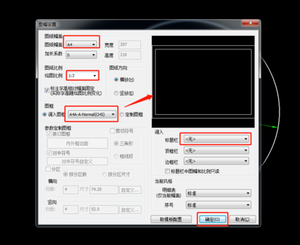 第二步如图所示点击“图幅比例”,会出现这个对话框,注意比例为“图纸大小/图形大小”。