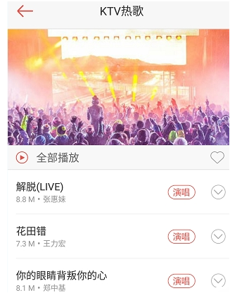 1、打开vv音乐,进入搜索歌曲界面;2、选择你想唱的歌,点击演唱,如下图所示: