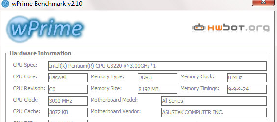 wPrime 大部分硬件信息感谢CPUz。它接收CPU信息,如时钟速度、代码名、缓存大小、电压等。它接收主板模型和内存的数量、速度和时间。