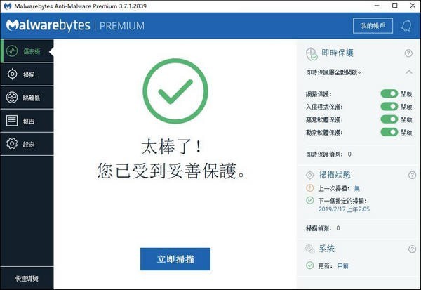 6.更新了仪表板设计,以更好地展示Malwarebytes实时保护功能;