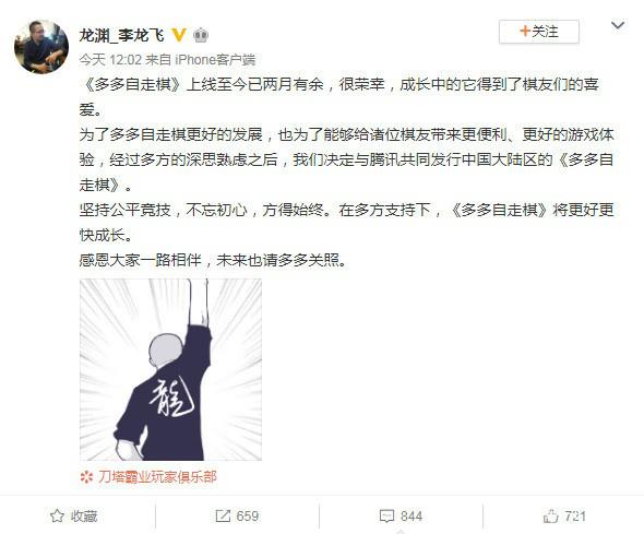 7月2日午间,《多多自走棋》的制作方龙渊网络的CEO发表微博,他表示为了多多自走棋更好的发展,也为了能够给诸位棋友带来更便利、更好的游戏体验。在经过龙渊和巨鸟多多工作室多方的深思熟虑之后,他们决定与腾讯共同发行中国大陆区的《多多自走棋》。而随后《多多自走棋》的官方微博也表示《多多自走棋》马上就可以使用QQ或者微信登陆了。