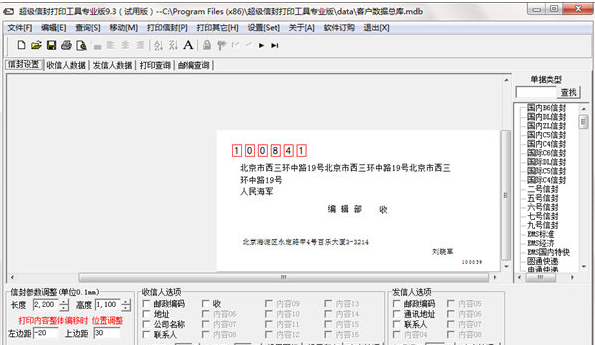 超级信封打印工具专业版支持各种格式打印信封、标签、报表、汇款单、包裹单、国际信封、明信片及自定义单据,支持office2000/97/95的数据导入、导出,所有打印内容(邮政编码、地址、单位、电话、姓名、称谓、传真、EMAIL、网址等)全部使用所见即所得的设置方式。