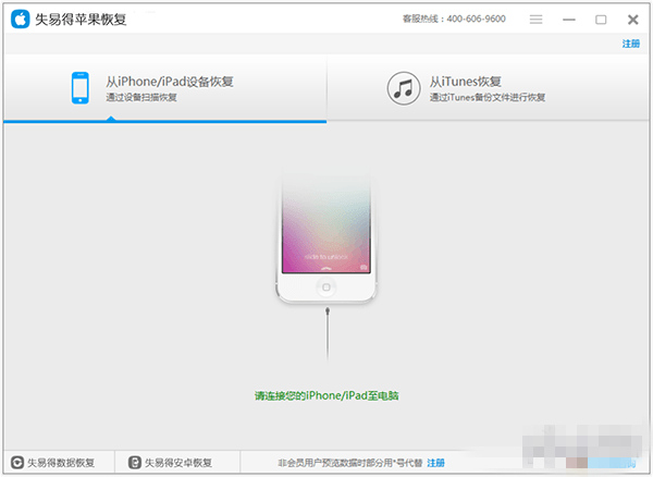 失易得苹果恢复是一款专业的苹果手机数据恢复软件,它有友好的使用者体验和向导操作,您只需三步骤即可恢复数据,即使您不熟悉也可以轻松通过电脑操作找到丢失的数据,它可以恢复iPhone/ipad的丢失数据,包括照片、视频、通讯录、书签、提醒和日历等。步骤1:将您的iOS设备连接到PC,或者打开您的iTunes备份。