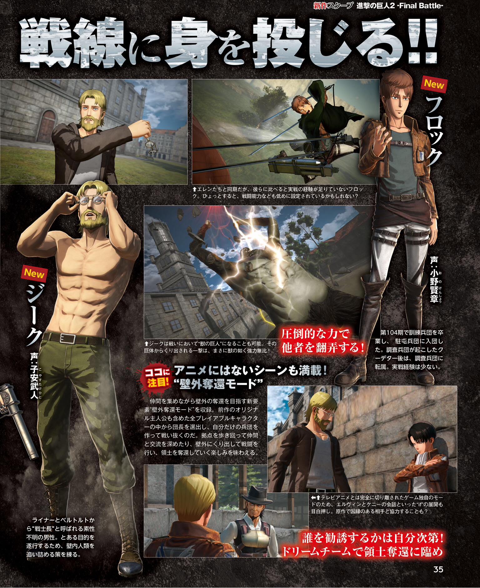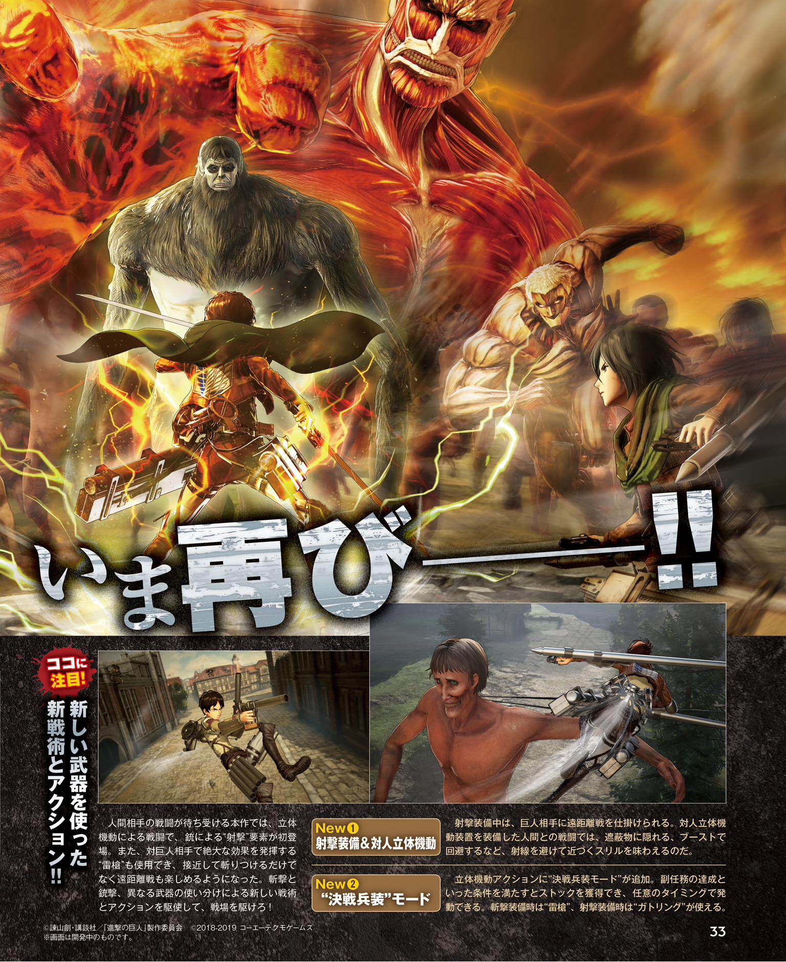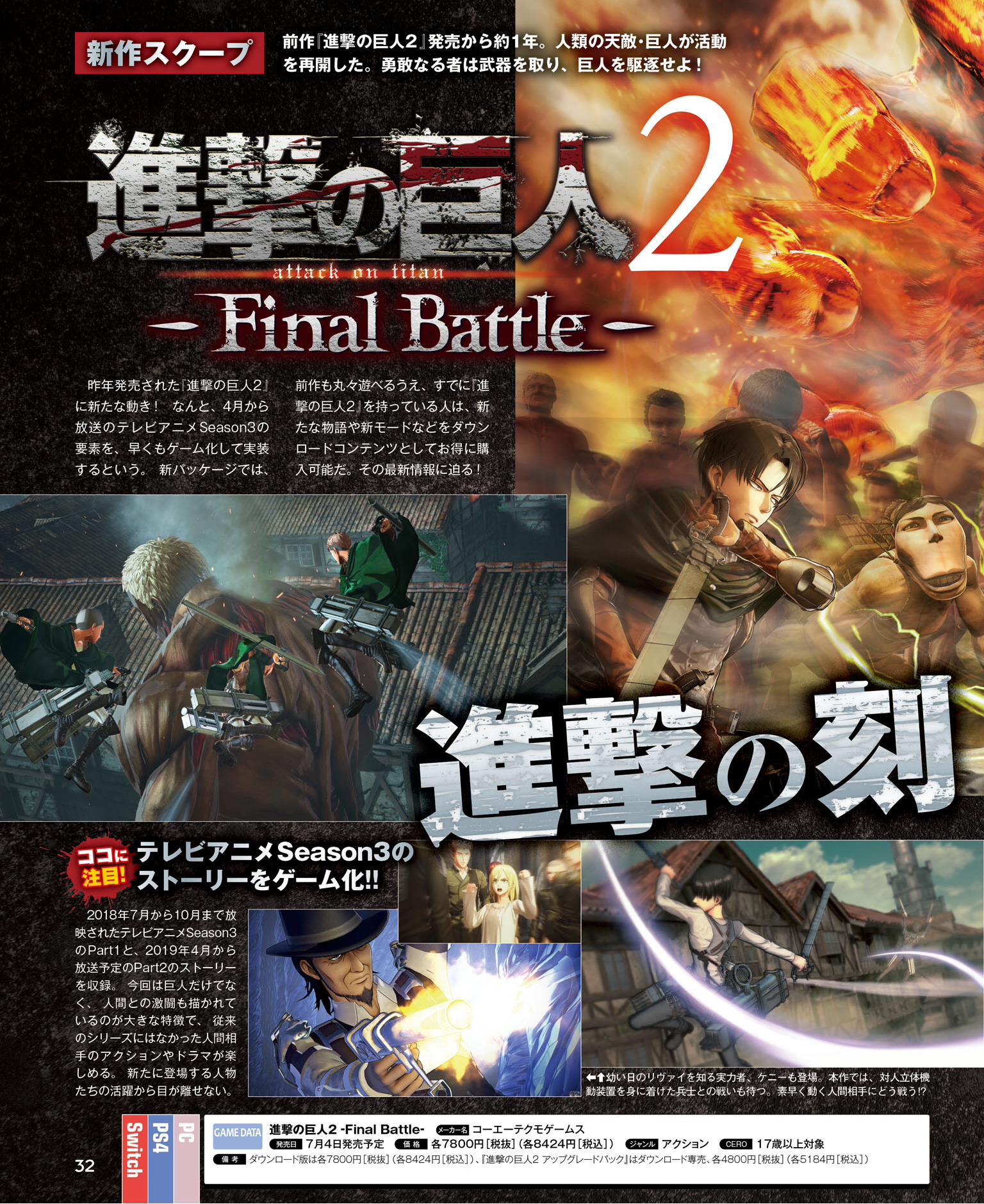 《进击的巨人2:最终之战(Attack on Titan 2: Final Battle)》官方近日宣布该作将登陆PS4、Xbox One、Switch、PC平台,并将在7月4日正式在日本发售,欧美地区将在7月5日发售。《进击的巨人2:最终之战》是之前2018年推出的《进击的巨人2》的资料片,加入了第三季的一些新角色,现在可玩角色共计超过40个,并增加了原创的剧情章节和新武器“雷霆之矛”等等。