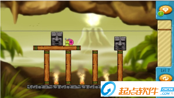 第一步,我们先利用核桃将蜗牛往右赶,让其顺着中间转动的十字架一直落到右边来;