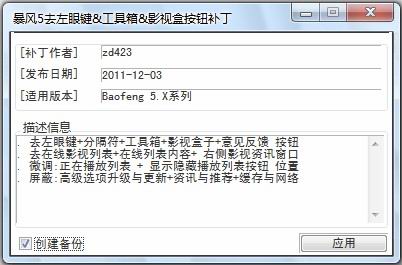 暴风影音5去左眼键按钮补丁是一款适用在暴风影音上去除左眼键影视盒子的工具。真正的解除在播放器上多余的按钮!使暴风更加简洁、更加美观!