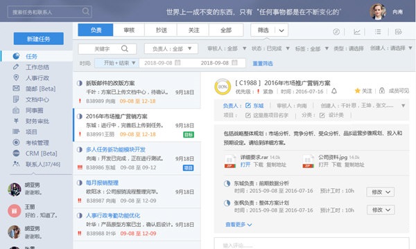 1、任务协作 :每个员工的工作待办列表,方便快捷的任务多人协作。上级可以随时分派,查看和指导下属的工作,确保工作进度和质量。取代内部邮件,充分发挥团队的智慧和力量!2、工作总结:随时随地写日报、周报、月报、季报,任务数据为基础参考。