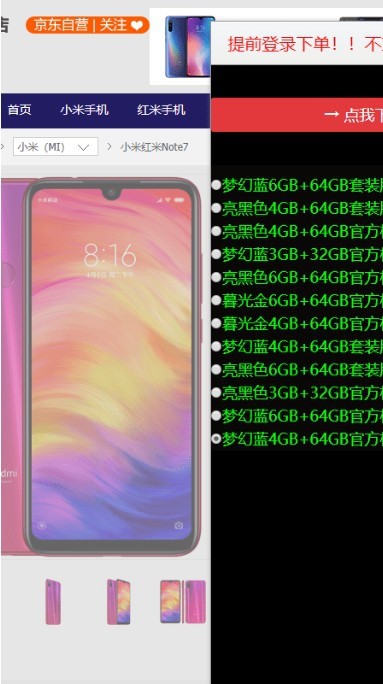 选择左侧型号,点击开始抢购,没有登录会跳转到登录。登录成功自动返回,再次点击开始抢购即可。图2推荐大家多申请几个京东账号,然后开隐身窗口,提前五分钟就开始让它自己下单去就行了。
