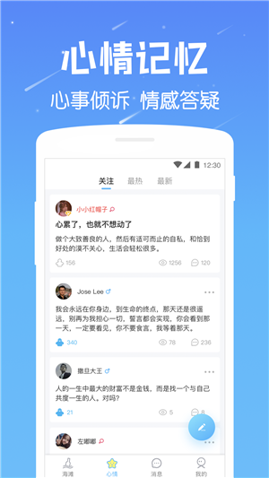 遇见漂流瓶app是陌生人匿名社交软件,也许你的下一份缘分就在这里!遇见漂流瓶app让你和好友有更多的互动机会,这里保护用户隐私。在这里,你可以讲述不能说的秘密,在这里,你可以尽情释放你的另一面!陌生人交友社区,让你无忧无虑,尽情讲述你的秘密。