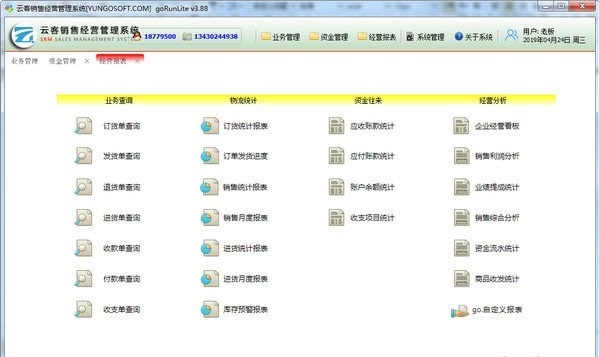 软件提供众多查询分析报表,用户可以方便的查询分析销售、采购、资金流、存货数据,并可一键将查询分析结果导出成excel或打印出来;查询分析报表显示内容支持灵活调整;同时提供无限扩展的自定义报表,理论上可以支持任意复杂的查询分析报表格式。