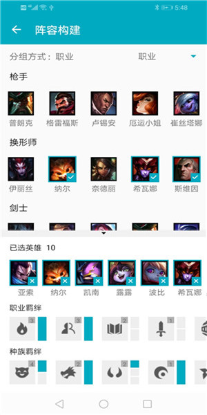 3、阵容构建功能,选择英雄构建你的阵容,在云顶之弈游戏助手中可以实时看到阵容的羁绊信息,羁绊属性。