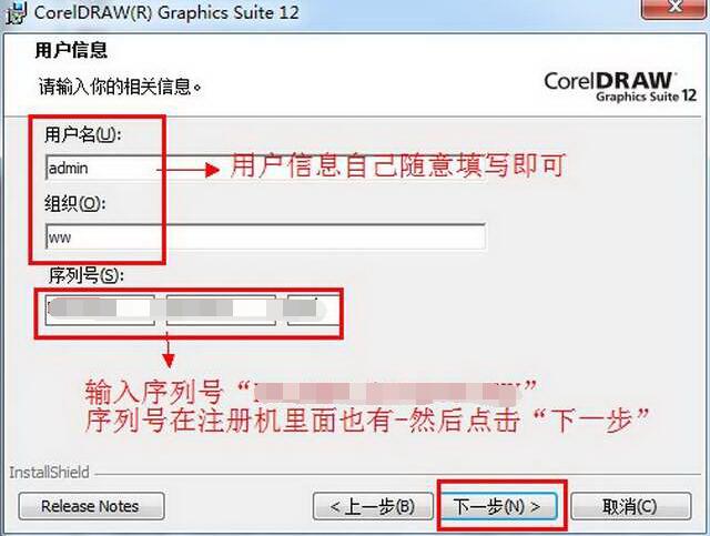 用户信息自己随意填写即可。CorelDraw 12【Cdr 12】序列号“(由于版权原因不显示了,自行百度)”输入正确后点击“下一步”按钮如图4。