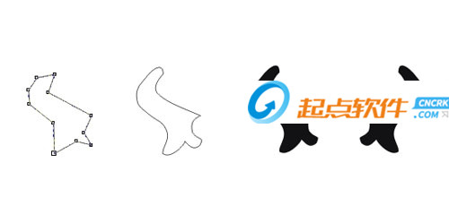制作盘子的支脚。用贝塞尔工具画出大致形状,用形状工具选中全部节点后按ctrl+Q转换为曲线,然后调节为如下形状,填充黑色。复制一份,水平翻转后挪到右边,将两个支脚放到盘子下部的合适位置,一个晶莹剔透的盘子就完工了。