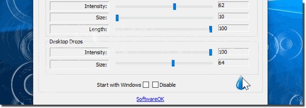 开始下雨。使用默认设置时,雨滴将首次落在桌面上,鼠标移动时会出现细微的雨滴痕迹。在没有鼠标轨道的模式下,只有当所有鼠标雨滴痕迹都消失在屏幕上时,只有雨滴落在桌面上。